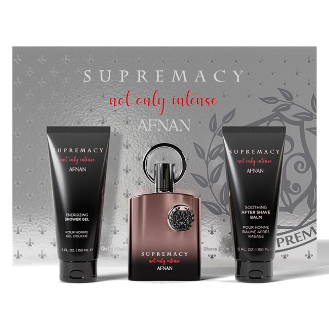 Setul Afnan Supremacy Not Only Intense EDP 100 ml + gel de dus 150 ml + aftershave 150 ml ofera o experienta olfactiva completa, combinand parfumul sofisticat cu produse de ingrijire personala. Parfumul prezinta note de varf de bergamota, mar si coacaze negre, note de mijloc de lavanda, paciuli si muschi de stejar, si note de baza de sofran, mosc si ambra cenusie.