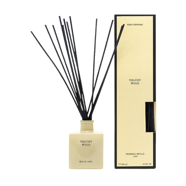 Difuzorul de parfum Cereria Molla 1899 Velvet Wood este un parfum de ambient pentru casa, cu note lemnoase calde si sofisticate, ideal pentru o atmosfera confortabila. Cereria Molla Velvet Wood combina acorduri lemnoase cu accente dulci si condimentate pentru un ambient elegant si persistent.