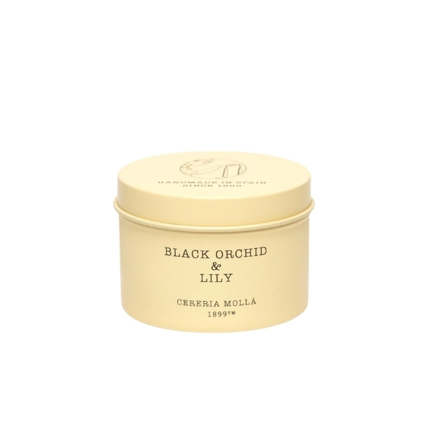 Lumanarea parfumata Cereria Molla 1899 Black Orchid & Lily Tin Travel este o lumanare pentru casa in format compact, cu parfum floral intens si sofisticat, ideala pentru utilizare oriunde. Cereria Molla Black Orchid & Lily combina note de orhidee si crin pentru un ambient elegant si persistent.