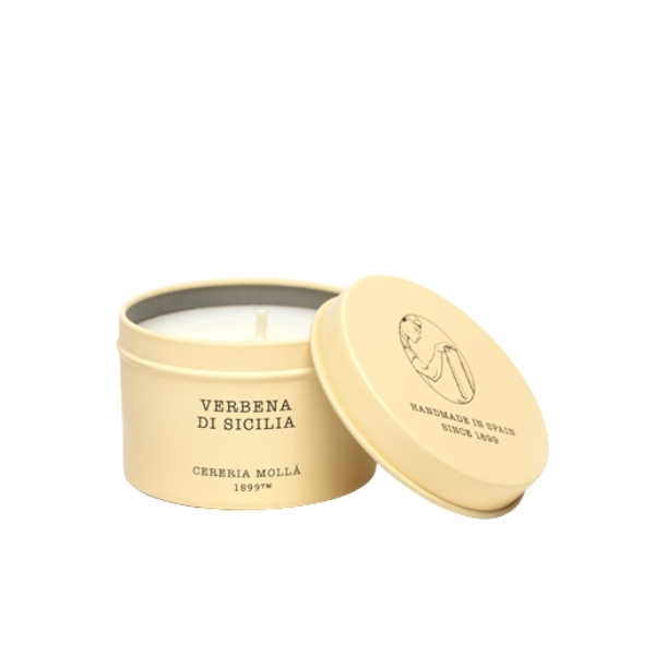Lumanarea parfumata Cereria Molla 1899 Verbena di Sicilia Tin Travel este o lumanare pentru casa in format compact, cu parfum citric-aromatic fresh si energizant, ideala pentru improspatarea incaperii. Cereria Molla Verbena di Sicilia combina note de verbina si citrice pentru un ambient luminos si revitalizant.