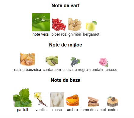 - Note de varf: ghimbir, bergamot, piper roz si note verzi