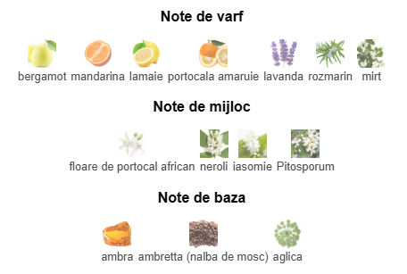 - Note de varf: Bergamot, Mandarina, Lamaie, Portocala Amaruie, Lavanda, Rozmarin si Mirto