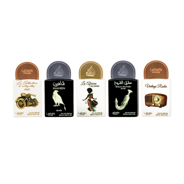 Set Lattafa Collection # 5 Unisex, Eau De Parfum, Bike1910 20ml + Shaheen Silver 20ml + African Drummer 20ml + Shuyukh Silver 20ml + Vintage Radio 20ml
