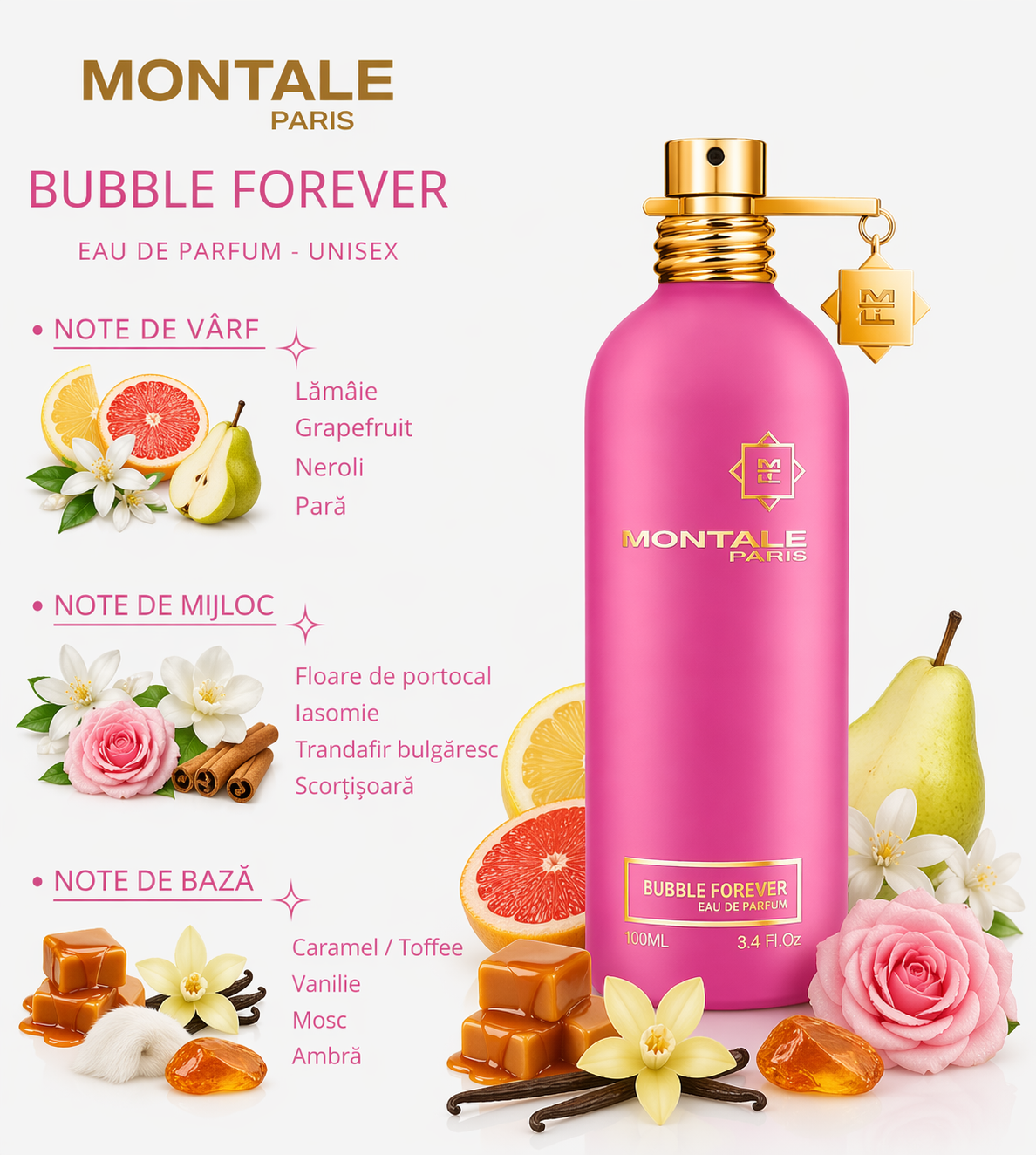 Parfumul Montale Bubble Forever este un parfum unisex dulce-fructat, jucaus si modern, ideal pentru cei care prefera arome gourmande si expresive. Montale Bubble Forever combina note dulci si fructate cu acorduri cremoase si accente vanilate pentru o aroma delicioasa si persistenta.