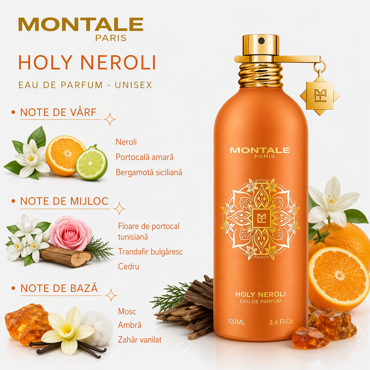 (0) Cod produs: 3760260458788Parfumul Montale Holy Neroli este un parfum unisex citric-floral, luminos si elegant, inspirat de prospetimea florilor de portocal si de energia zilelor insorite. Montale Holy Neroli combina neroli, bergamota si portocala amara cu floare de portocal, trandafir si cedru, completate de mosc, ambra si zahar vanilat pentru o aroma echilibrata, proaspata si senzuala