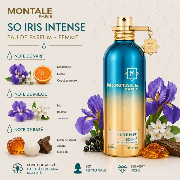 (0) Cod produs: MONT00006Parfumul Montale Intense So Iris este un extract de parfum unisex floral-lemnos, elegant si sofisticat, ideal pentru cei care prefera aromele pudrate si rafinate. Montale Intense So Iris combina iris, lemn de santal si mosc alb pentru o aroma catifelata, curata si persistenta