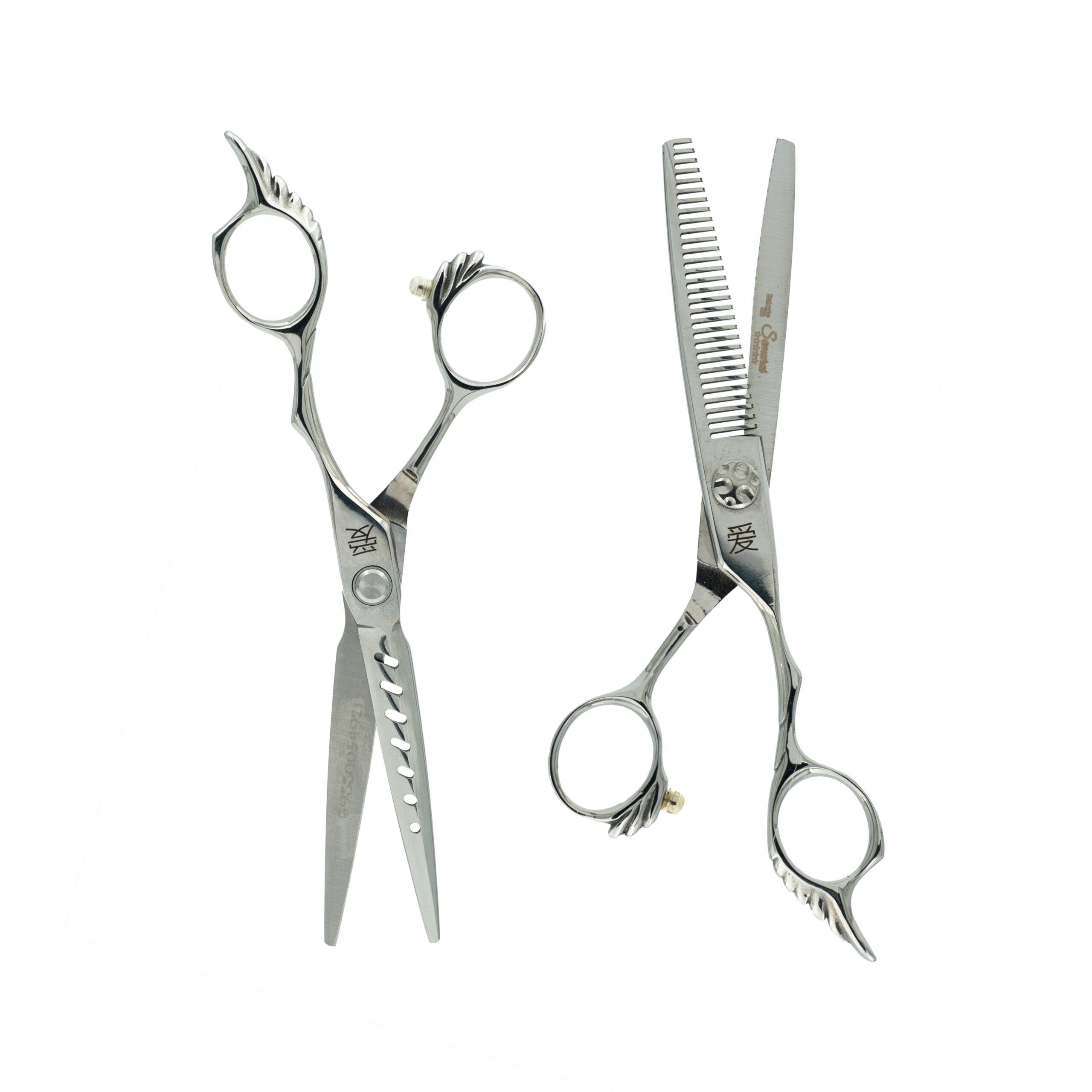 "Samurai" foarfeca faurita in intregime in Japonia din otel de cea mai buna calitate. Manerul offset curge delicat catre suportul fix pentru deget, permitand totodata taierea cu o pozitie mai joasa, mai putin stresanta pentru brat. Lamele convexe extrem de ascutite, sunt realizate din otel japonez inoxidabil si sunt mai inguste la baza. Acest lucru aplica o greutate mai mare atunci cand este nevoie, facand slice-ul o placere si dezvolta o putere crescuta facand usoara taierea bruta. Varfurile lamei sunt ascutite, oferind un control deosebit pentru taieturi de precizie. Per ansamblu aceste foarfece sunt balansate exemplar si au un surub de tensiune ajustabil, pentru a fi setat dupa preferintele fiecaruia. Surubul este creat din 9 rulmenti. Unul mare, principal, ce ruleaza maxim pe metal si 8 mici ce maximizeaza flexarea foarfecii la calitate maxima.