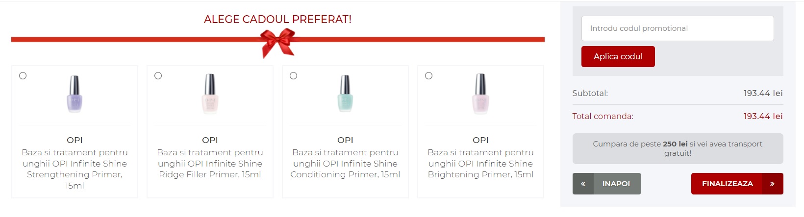 Pentru a putea participa la campania promotionala, Participantul trebuie sa achizitioneze produse de minim 250Lei. Produsele cadou dosponibile vor aparea in cos in momentul in care acesta depaseste valoarea de 250lei. Participantul trebuie sa bifeze cadoul dorit din cele afisate/disponibile.Promotia se ofera in limita stocului disponibil.